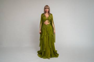 Alberta Ferretti ha vestito una delle 13 statue di cera di Taylor Swift appena svelate con un look personalizzato ispirato al Taylor Swift, The Eras Tour, un abito in chiffon verde con maniche a tromba, scollatura profonda, dettagli in tulle effetto vedo-non-vedo e foglie ricamate.