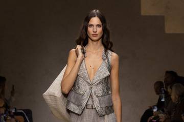 In passerella, per la collezione Emporio Armani per la primavera estate 26, l'ultima disegnata dal Signor Armani, capi sporty chic, fluidi, leggeri. Capi nati dal desiderio di catturare l'impulso e il sentimento mutevole che accompagna il ritorno in città dopo un viaggio. In quel breve momento, prima che i ricordi scoloriscano, il quotidiano si tinge di forme e motivi che arrivano da lontano.