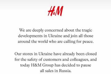 H&M, si legge sulla pagine Instagram del gruppo svedese, dopo aver chiuso i negozi in Ucraina per tutelare la sicurezza dei dipendenti e dei clienti, ha deciso di sospendere le vendite in Russia.