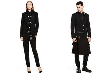 La linea è in total black, con smoking per donna. Per l'uomo il designer ha pensato a giacche con fibbie su kilt e pantaloni oversize.