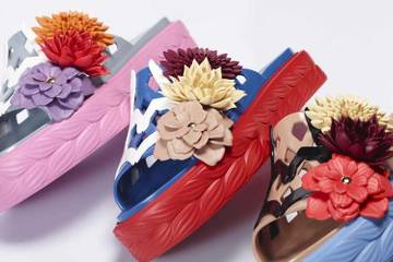 La borsa Parati, tutta giocata su motivi a intreccio, realizzata in plastica a iniezione, è proposta in quattro diverse combinazioni di colore: ai toni del nero, del bianco ottico e del grigio si accostano note di colore più decise, dal rosa al porpora, fino all’arancione. A lato, due mani unite a forma di cuore richiamano il tema dell’amore universale, mentre vere speciali riproduzioni di peonia, ranuncolo, orchidea, anemone e dalia di diverse forme e colori rimandano alle atmosfere lontane dei paesi esotici. I fiori sono il tema dominante anche del sandalo Claudia, che ripropone lo stesso motivo a cuore della borsa e gioca su un divertente effetto bicolore.