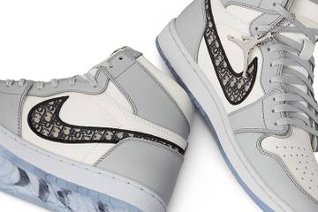 Il design della scarpa riprende la silhouette della classica Nike Air Jordan 1 con dettagli in colore grigio Dior, mentre l'iconico swoosh, il logo Nike, presenta il jacquard obliquo di Dior. Lo stesso motivo è anche presente sulle solette, ridimensionato e inciso al laser.