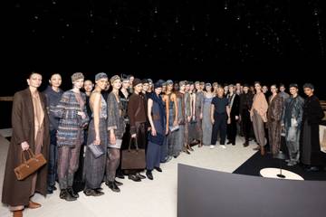 Le linee rigorose si ammorbidiscono nelle scelte di materie gentili e dense al tatto come i velluti, i cashmere, le sete jacquard. Le radici dello stile Armani attingono a diversi ambiti culturali, alle forme semplici che richiamano l’Oriente, ma anche il Sud, in una fantasia lieve senza tempo. I tailleur sono fluidi con i pantaloni di seta, i cappotti decostruiti e preziosi, le giacche dall’aplomb impeccabile. Di sera, la creatività si abbandona a ricami brulicanti su abiti impalpabili.