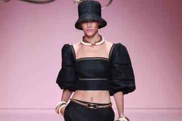 Maxigonne con balze e crop top, abiti con maniche scese a palloncino o sinuosi senza spalline sono proposti in lino e arricchiti da decorazioni a greca che esaltano la ricchezza e tattilità del tessuto, mentre completi pantalone in lino dalla fattura sartoriale abbandonano la giacca in favore di gilet che disegnano la figura.