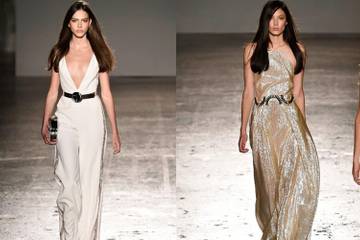 L’ispirazione Decò si fa più evidente negli abiti. Tra i capi in passerella anche un fluido modello da sera con spacchi frontali in un’accesa tonalità di verde smeraldo, unica nota di colore nella palette giocata sulle sfumature del bianco illuminato da accenti metallici.