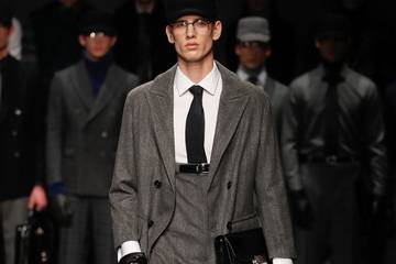Un altro tessuto protagonista è il pied de poule composto di lana shetland al 100 percento. A spiccare sono due capi iconici del marchio del menswear, ovvero il tre pezzi e il cappotto in lana, tipico abbigliamento dei professionisti londinesi.