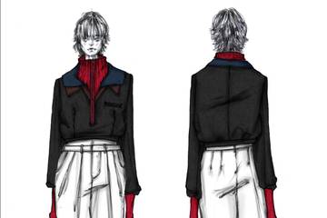 Di seguito la descrizione dei due capi scelti: giacca crop in tela di lana, arricchita da un doppio collo, uno in spigato di lana e uno alto in maglia a coste, con guanti in maglia abbinati. L'altro capo è una gonna midi stampata, realizzata in saglia di cupro, caratterizzata da drappeggi strategici che valorizzano il movimento e la costruzione del volume.
