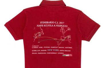Il retro della polo illustra l’itinerario della Campagna di Istruzione 2017 che toccherà i porti di: Sines (Portogallo), a seguire Funchal (Portogallo), Hamilton (Bermuda), Halifax (Canada), Montreal (Canada), Quebec City (Canada), Boston (USA), New York (Usa), Ponta Delgada (Portogallo), Malaga (Spagna), Barcellona (Spagna). Per poi rientrare in Italia passando da Portofferaio e facendo tappa finale a Livorno.