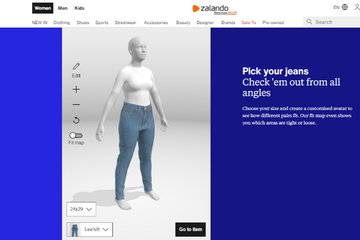 Zalando ha messo a punto un camerino virtuale. Grazie a questa funzione, i clienti possono creare un avatar in 3D inserendo la propria altezza, il peso e il genere. Per una gamma selezionata di jeans (22 articoli) i clienti possono vedere come le diverse taglie si adattano a loro, aiutati da una