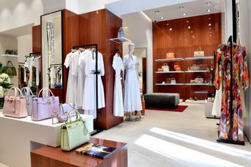Lo spazio espositivo copre una superficie di 123 metri quadrati e ospita la collezione Marciano, affiancandola a una selezione di borse, calzature e jewellery.