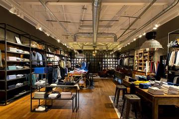 Lo store copre una superficie di 157 metri quadrati. Il design interno unisce elementi vintage come poltrone in pelle naturale e sgabelli in ghisa, con lampade da tavolo in stile industriale presenti in punti focali del negozio. Il pavimento in rovere chiaro risalta i tappeti vintage grigi e blu navy. Le porte scorrevoli ricordano le vecchie fabbriche degli anni ’40 e ’50 e accolgono gli ospiti all’entrata.