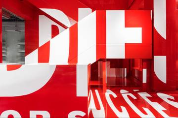 L’interno incarna un’estetica brutalista moderna ispirata all’identità urbana grezza di Berlino. Texture ruvide si incontrano con tagli netti, superfici solide si contrappongono a esposizioni di prodotti meticolosamente curate, creando un dialogo sorprendente tra struttura e stile. Il cuore del negozio è l’area denim, caratterizzata da un’installazione visiva d’impatto di un rosso intenso, ispirata all’iconico logo biscotto di Diesel.