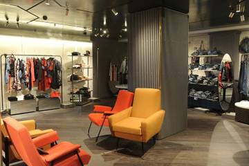 Il negozio, su due piani, utilizza materiali ricchi come il legno ma con un'aria fané, il parquet, per esempio, è recuperato, così come alcune pareti sono grezze, in cemento, per richiamare le origini del marchio, nato a Parigi nel 1968 e poi acquisito da Benetton nel 1974.