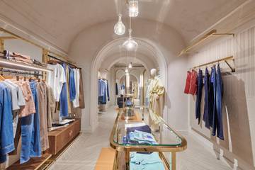 Sofisticati arredi in legno, elementi decorativi in ottone e lampadari in vetro completano l’ambiente, creando una raffinata cornice per le collezioni uomo e donna Jacob Cohën.