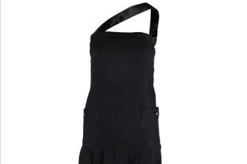 Il capo è realizzato in misto seta nero, con una plissettatura sull'orlo, una singola bretella incrociata sulla spalla e chiusura con bottoni sul retro. I bottoni hanno una decorazione floreale in tono dorato. Da non trascurare le due tasche a toppa frontali con bottoni e la cintura incorporata all'interno. Si può indossare con o senza la bretella rimovibile sul collo.
