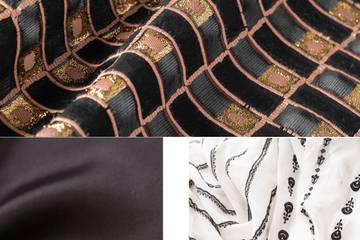 The perfect blend of aesthetic with technical aspects is realized with jacquard in the form of bright silk/viscose on super shiny duchesse with a colorful base and bright contrasting details. Lurex fil-coupè on an embossed armor make up a decò-inspired geometric theme that balances between density and transparency. The jacquard georgette has irregular stripes with vintage ribbon patterns in black and white. Floral-themed 3D surfaces in hot pink find light in gold lurex micro polka dots. Shiny turquoise fringed spots on a lawn green base identify a post-contemporary camouflage.